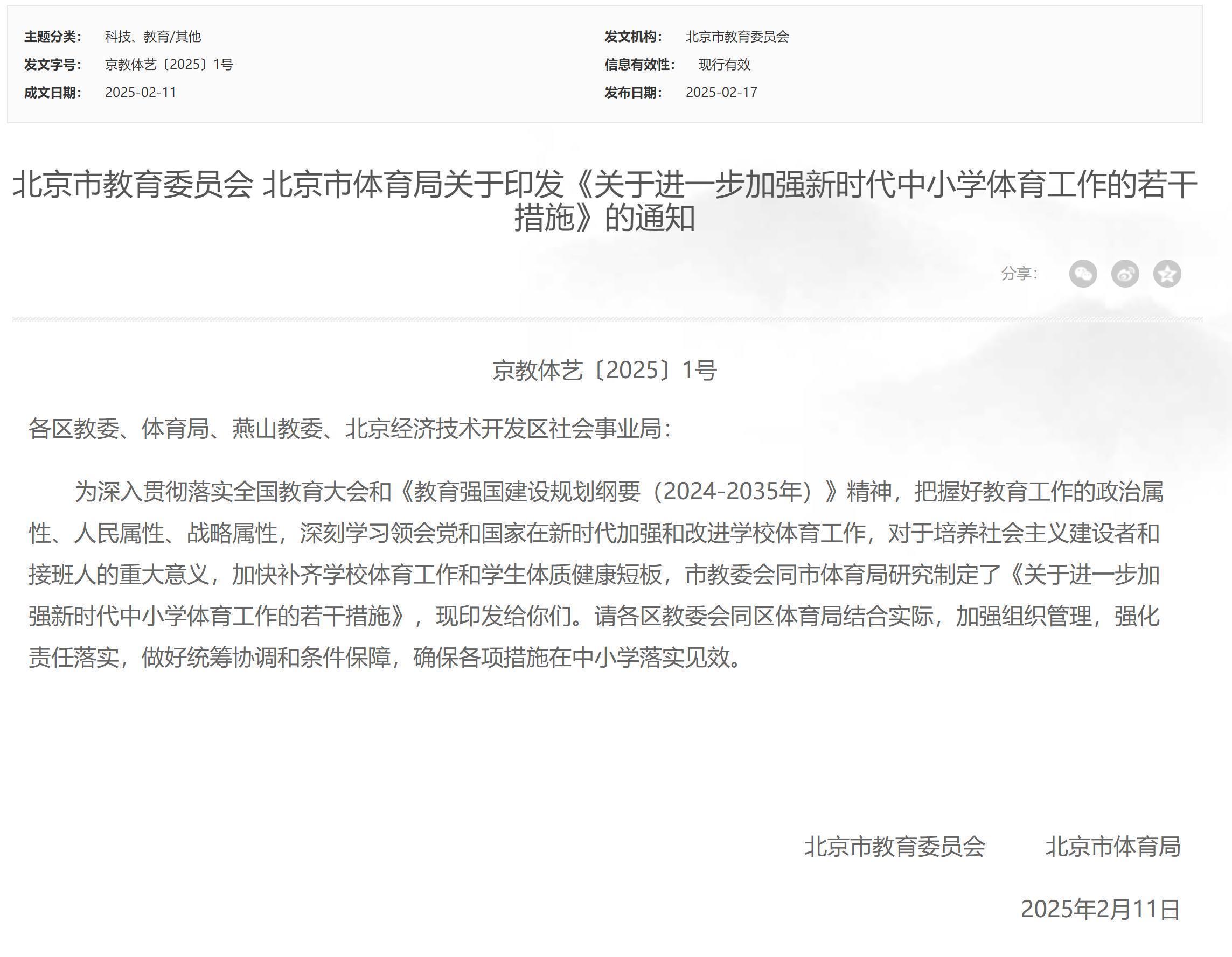 人民网北京2月17日电 2月17日,北京市教委、北京市体育局联合印发的《关于进一步加强新时代中小学体育工作的若干措施》,即北京市中小学“体育八条”正式发布。北京市将通过打造“能出汗的体育课”、大力开展学生班级联赛等8条举措,将身心健康教育融入学校全员、全方位、全过程育人体系。